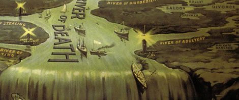 Observo una litografía titulada Falls of Eternal Despair, de un autor desconocido y fechada en 1895. Es un mapa bastante divertido que traza un diagrama del Paraíso y el Infierno; el Río de la Muerte tiene muchos afluentes, como el Río de la Desobediencia a los Padres, que se extiende por la zona pantanosa de la Glotonería. En comparación con el Infierno, la descripción del Paraíso, como siempre, decae, no sé por qué.