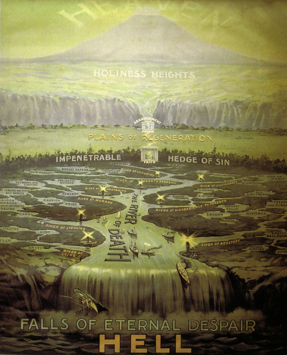 Observo una litografía titulada Falls of Eternal Despair, de un autor desconocido y fechada en 1895. Es un mapa bastante divertido que traza un diagrama del Paraíso y el Infierno; el Río de la Muerte tiene muchos afluentes, como el Río de la Desobediencia a los Padres, que se extiende por la zona pantanosa de la Glotonería. En comparación con el Infierno, la descripción del Paraíso, como siempre, decae, no sé por qué.