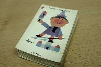 A través de Drawn!, un muy recomendable blog sobre ilustración, descubro un juego de naipes francés, Jeu de 7 familles, en el que las cartas, ilustradas por un genio desconocido y fotografiadas por Papel Continuo se ordenan por ocupaciones —escultores, pintores, diseñadores, arquitectos, etc—. Delicioso.
